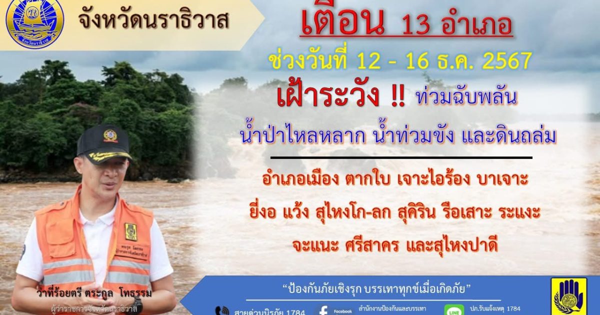 ปภ. แจ้งเตือน 13 อำเภอ 30 มีนาคม 2568 โดย Abdulloh / ข่าวประชาสัมพันธ์,ข่าวประชาสัมพันธ์,ข่าวประชาสัมพันธ์,ข่าวประชาสัมพันธ์,ข่าวประชาสัมพันธ์,ข่าวฝากประชาสัมพันธ์ ปภ. แจ้งเตือน 13 อำเภอ🚨เฝ้าระวัง‼️น้ำท่วมฉับพลัน น้ำป่าไหลหลาก น้ำท่วมขัง และดินโคลนถล่ม ในช่วงวันที่ 12 – 16 ธันวาคม 2567📣ขอให้ประชาชนพื้นที่เสี่ยงภัย ติดตามสถานการณ์และการแจ้งเตือนอย่างใกล้ชิด หากประสบภัยหรือต้องการความช่วยเหลือ โทรสายด่วนนิรภัย 1784#สายด่วน1784#ปภนราธิวาส#กรมป้องกันและบรรเทาสาธารณภัย FacebookFacebookXXLINELine